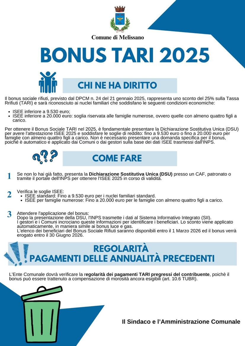 - Controllare la propria bolletta: a partire dalla bolletta TARI 2026, si dovrà verificare la presenza della voce che indicherà l'applicazione del bonus, se si è beneficiari.