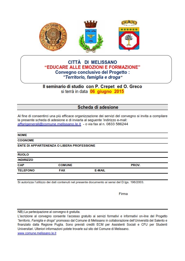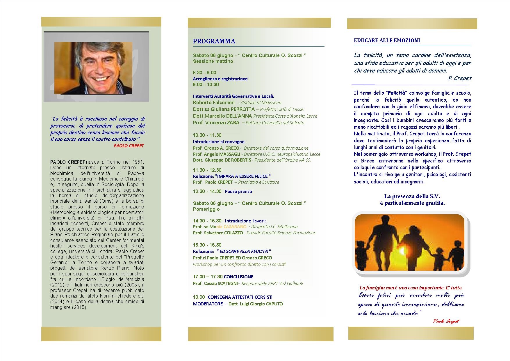 – CONVEGNO CONCLUSIVO – X° SEMINARIO Con il Prof P. CREPET ed il Prof. O.GRECO “EDUCARE ALLE EMOZIONI: IMPARIAMO AD ESSERE FELICI ” 06 giugno 2015 Data: