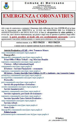 Attivazione immediata del Centro Operativo Comunale (C.O.C.), al fine di fronteggiare l’emergenza segnalata, nell’ambito del territorio del Comune di Melissano, la direzione ed il coordinamento dei servizi nonché l’attivazione delle aziende attrezzate con mezzi idonei all'evento.