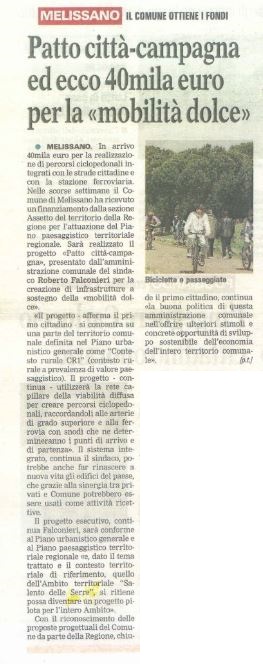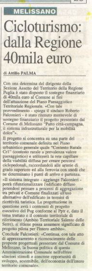 Descrizione Patto città-campagna. Finanziamento da parte della Regione Puglia di €.40.000 per la "mobilità dolce"Comunicato stampa pubblicato sul quotidiano di Lecce e Gazzetta del Mezzogiorno