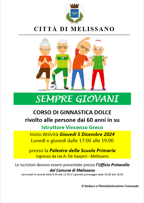 Il corso di ginnastica dolce “SEMPRE GIOVANI” rivolto ai cittadini da 60 anni in su sarà avviato giovedì 5 dicembre 2024 presso la Palestra della Scuola Primaria "Don Quintino SIcuro", con ingresso da via De Gasperi.